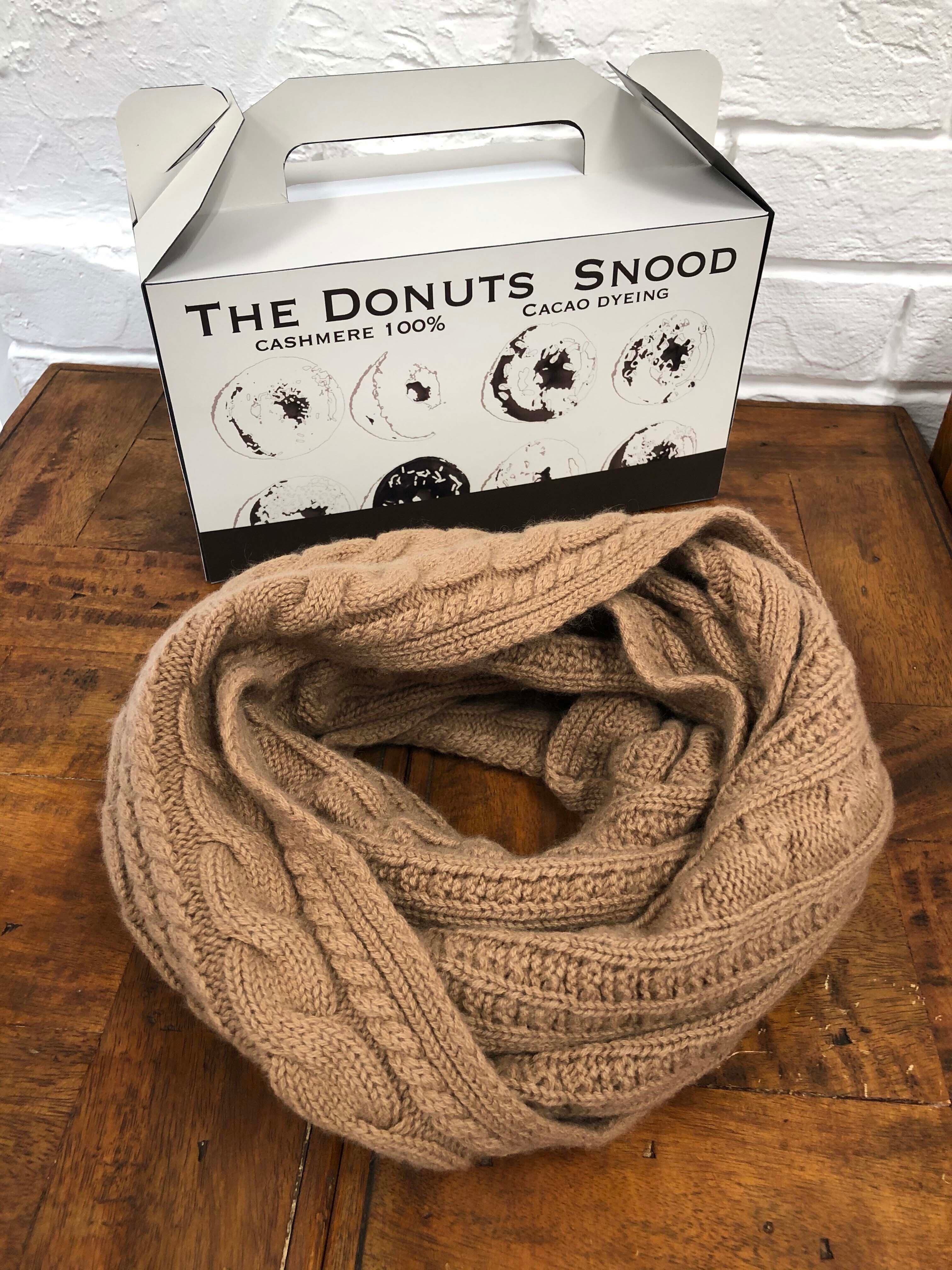 ケーブル編み。サイズ37cm×66cm(円周132cm)。重さ190g。糸番手2/26。カシミヤ100%のニットをカカオ100%の天然染料で染めた後、色の定着をさせる化学染料を程よいバランスで染色しました。ドーナッツをイメージしたスヌードマフラー(輪っか型のマフラー)です。オリジナルドーナッツ型BOX付きです。