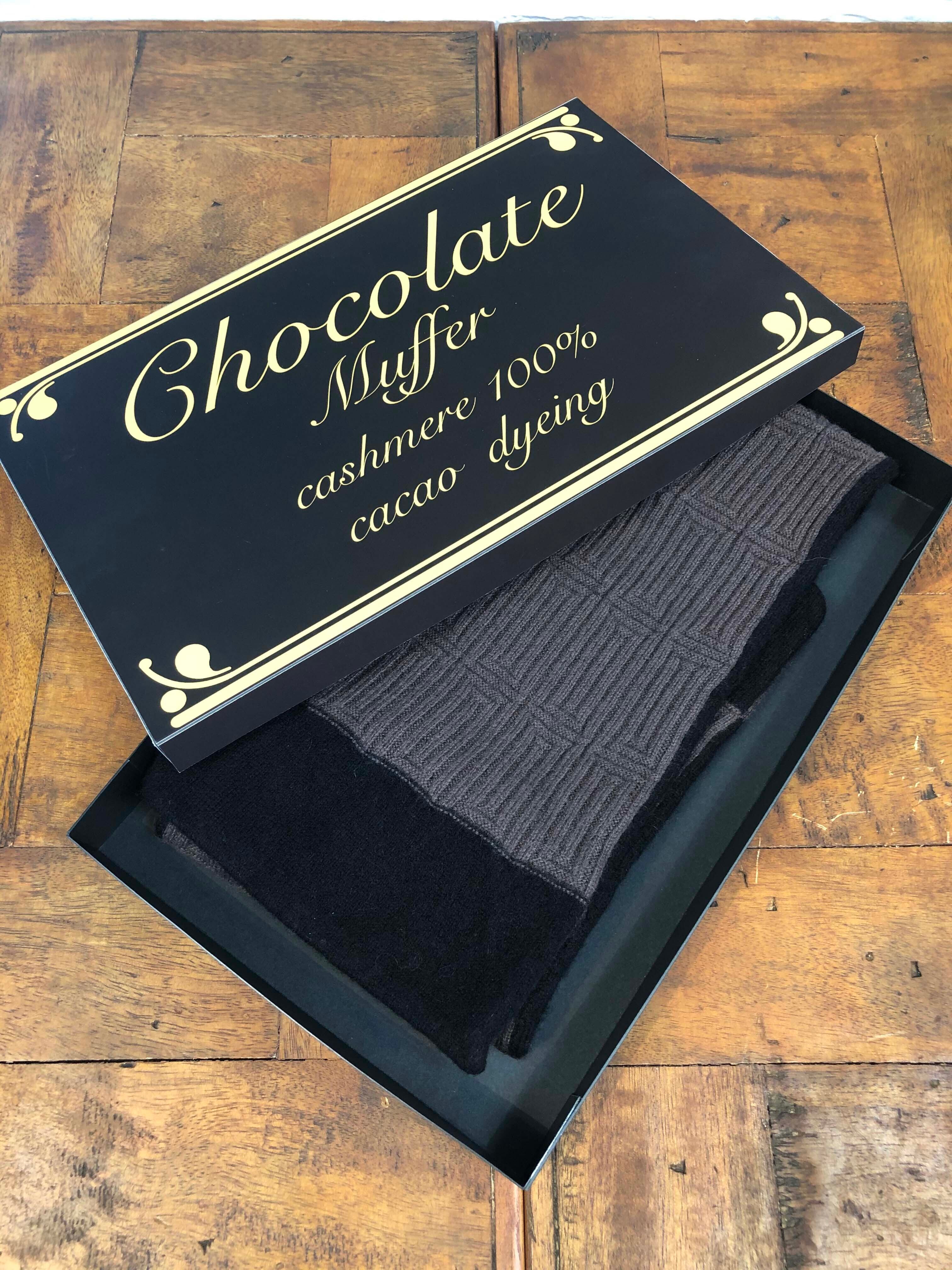 サイズ18cm×90cm。重さ71g。糸番手2/26。カシミヤ100%のニットをカカオ100%の天然染料で染めた後、色の定着をさせる化学染料を程よいバランスで染色しました。チョコレートをイメージしたミニマフラーです。オリジナル板チョコレート型BOX付きです。
